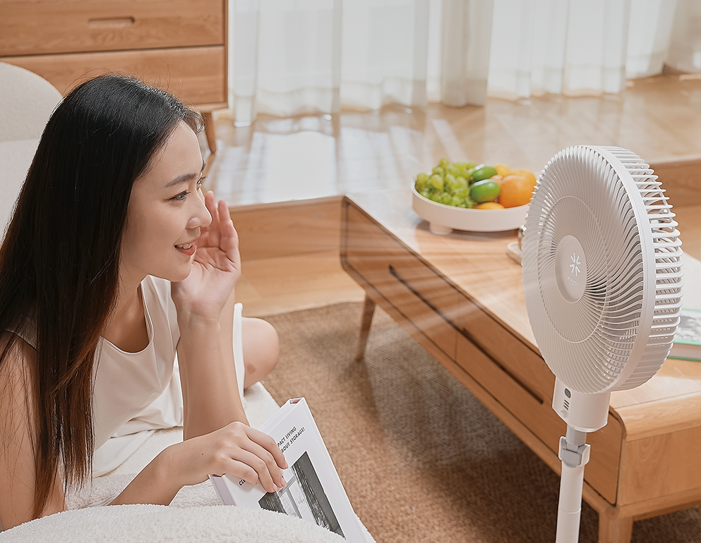 Ventusの縦型ファンは、空気力学に基づいた二重構造羽根を採用し、風量の増大と騒音の低減を実現し、落ち着いた快適な環境を提供します。